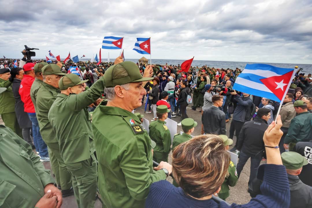 Junto al presidente Miguel Díaz-Canel Bermúdez, el Comandante del Ejército Rebelde José Ramón Machado Ventura, miembros del Buró Político, dirigentes del Partido, la UJC, las organizaciones de masas y sociales, integrantes de la Asociación de Combatientes de la Revolución Cubana, las Fuerzas Armadas Revolucionarias y el Ministerio del Interior, los habaneros también marcharon en denuncia del bloqueo genocida y los pronunciamientos hostiles del presidente Donald Trump y su secretario de Estado, Marco Rubio.