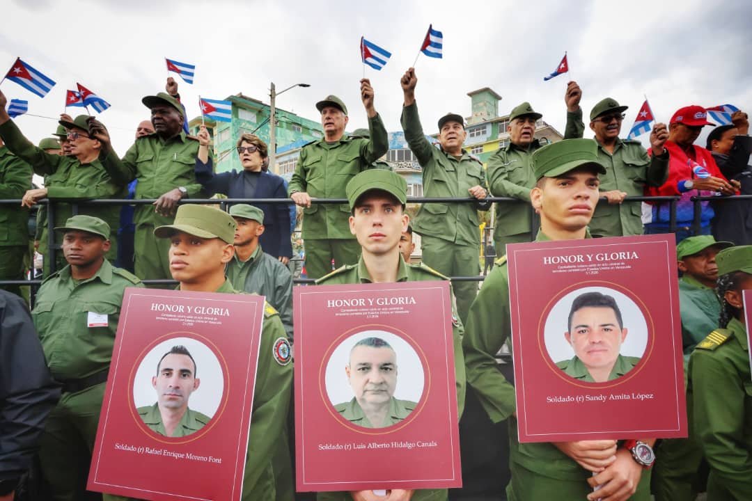 Más de 500 000 habaneras y habaneros, en representación de todo el pueblo cubano, avanzaron la mañana de este viernes en marcha combatiente para rendir homenaje a nuestros 32 hermanos caídos heroicamente en Venezuela en combate desigual contra las tropas élites del imperialismo yanqui que ilegalmente irrumpieron en tierra bolivariana para secuestrar al presidente Nicolás Maduro Moros y su compañera, Cilia Flores.