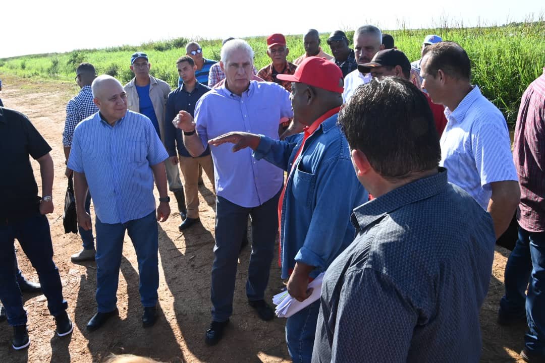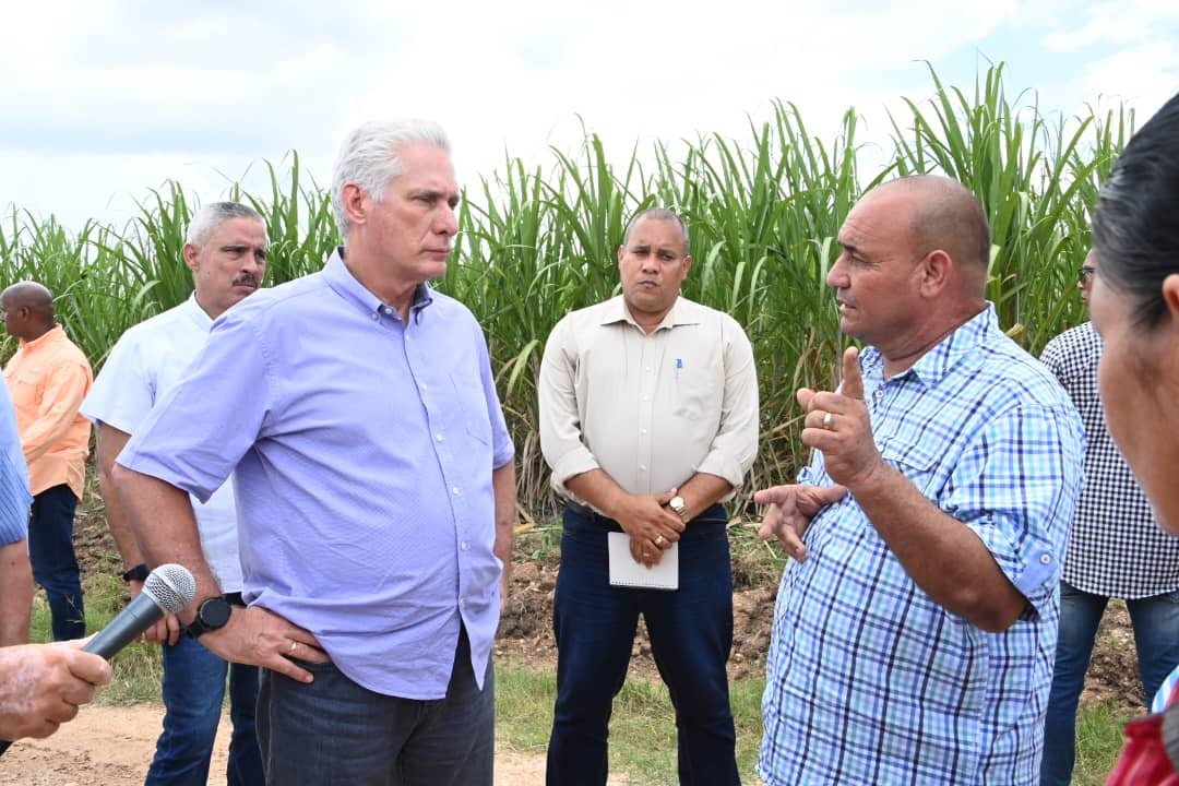 El otro lugar en el recorrido fue un área sembrada de caña, también perteneciente a la UBPC “Argelio Calderón”. Allí explicaron al mandatario sobre la estrategia de seguir creciendo en ese tipo de cultivo. Entre trabajadores y directivos, el Jefe de Estado hizo énfasis en la importancia de diversificar producciones, siempre teniendo presente la necesidad de sembrar todo el alimento que sea posible.