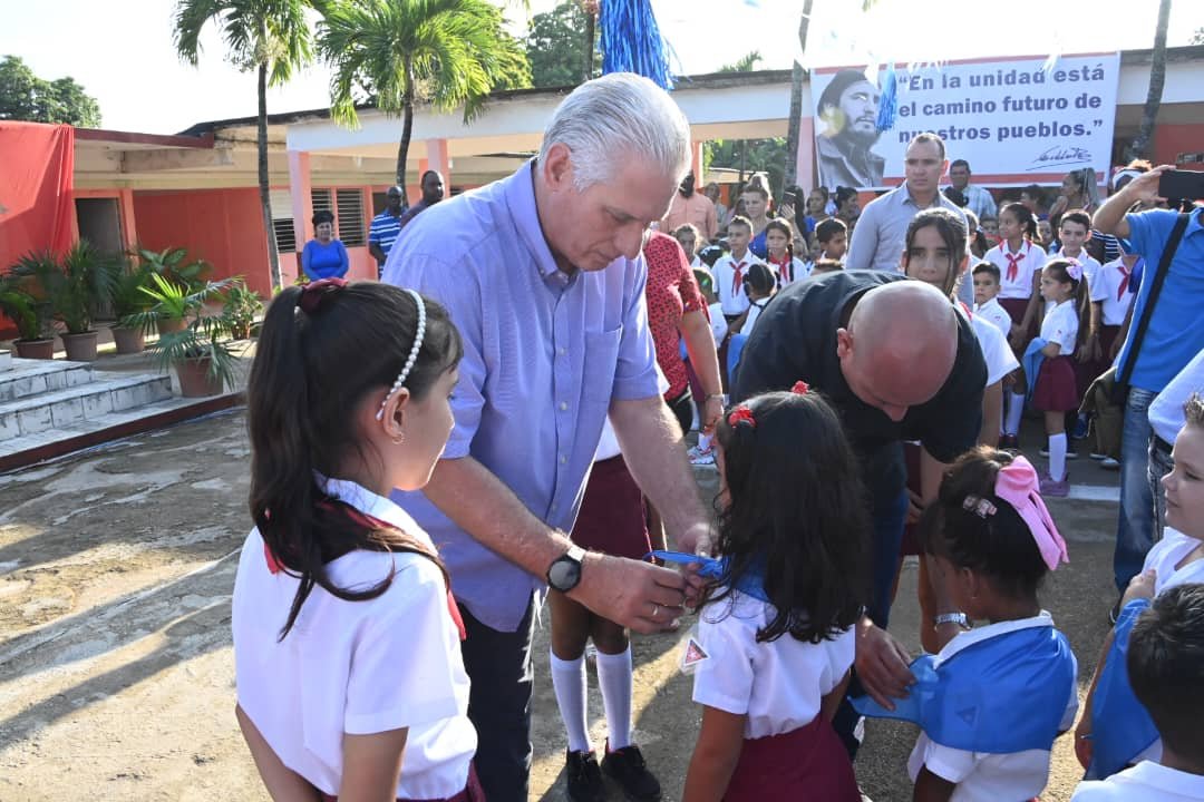 En un matutino donde hijos, padres y maestros confluyeron para verse con la Patria y anudar las pañoletas a 88 cubanos, el Presidente Díaz-Canel Bermúdez puso el símbolo azul sobre los hombros de una niña; y en ese gesto, era como si miles de padres hicieran lo mismo, al unísono, en una jornada que se repite, con amor, año tras año.
