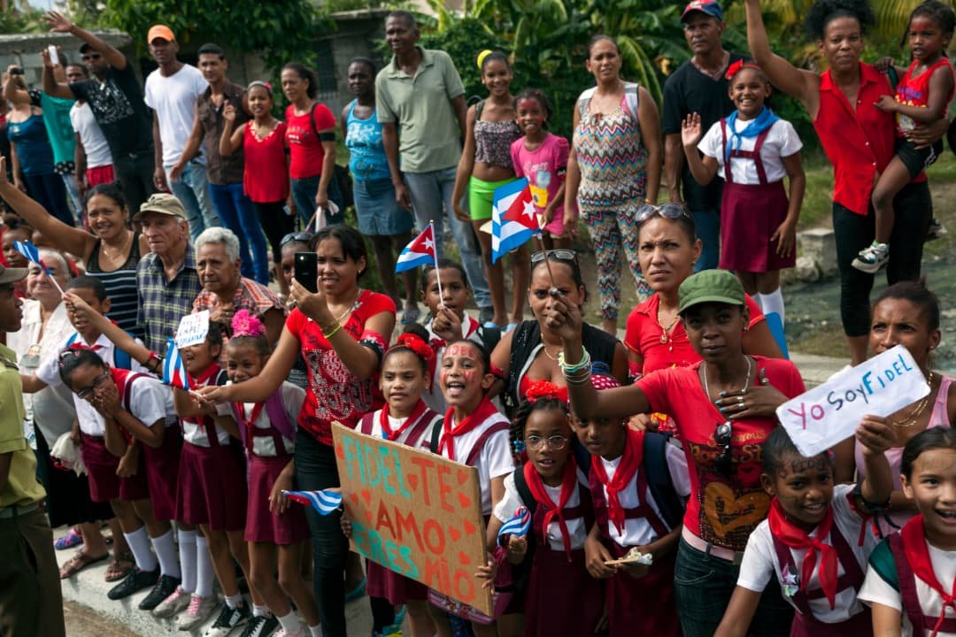 Sobre un puente y en medio de dos carteles con su imagen puestos en las barandas, hay un joven oficial del Minint. En firme ve el avance de la caravana por debajo. Camarógrafos y fotógrafos del territorio graban todo sobre el techo de una parada de ómnibus. Los policías que han organizado a quienes esperan, cuando se acerca, se ponen de frente y militarmente saludan. Los balcones de unos edificios verdes, a unos diez metros de la calle, están llenos de gente.