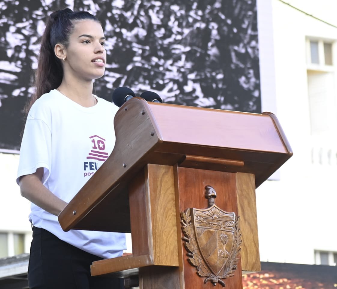 Luego subió a la tribuna la estudiante de tercer año de la Facultad de Diseño de la Universidad de La Habana, Leanet Proenza, quien recordó a todos que los imperialistas «solo han logrado que nos reinventemos», y que «rendirnos nunca será una opción».