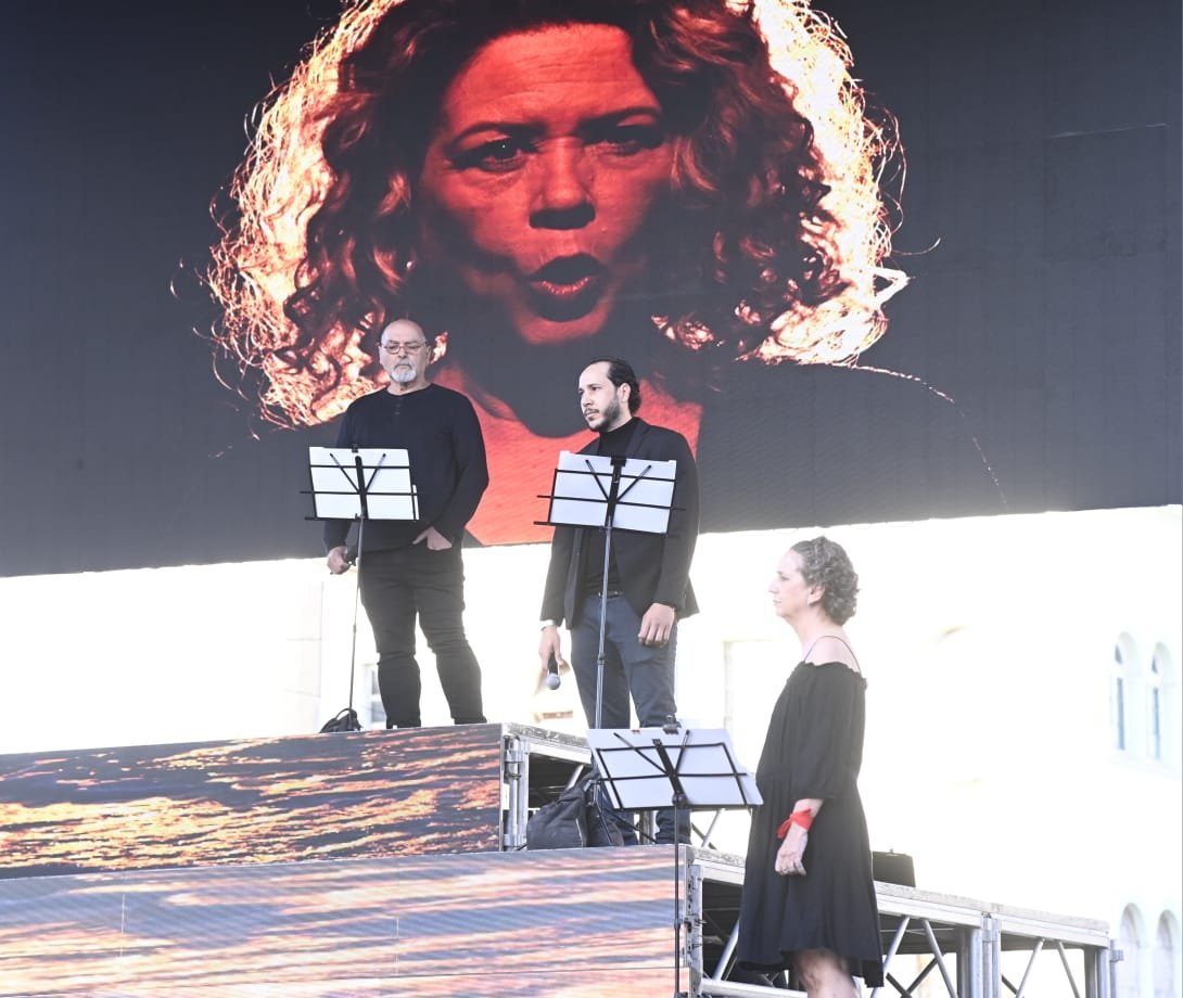 La compañía infantil «La Colmenita» interpretó, de Silvio Rodríguez, «Me acosa el carapálida»; y los actores Julio César Ramírez, Milva Caridad Benítez, Denny Ramos, y Mirtha Lilia Pedro, interpretaron «Manifiesto», de los poetas Waldo Leyva, Ricardo Riverón, y Jorge Ángel Hernández. Seguidamente, y representando al sector de la investigación y la innovación, la joven Anabel Serrano Díaz, investigadora del proyecto Jusvinza del Centro de Ingeniería Genética y Biotecnología (CIGB), subió a la tribuna para recordar que aquellas horas de abril decidieron mucho en la historia patria, y que lo del bloqueo imperial no es «un hecho abstracto».