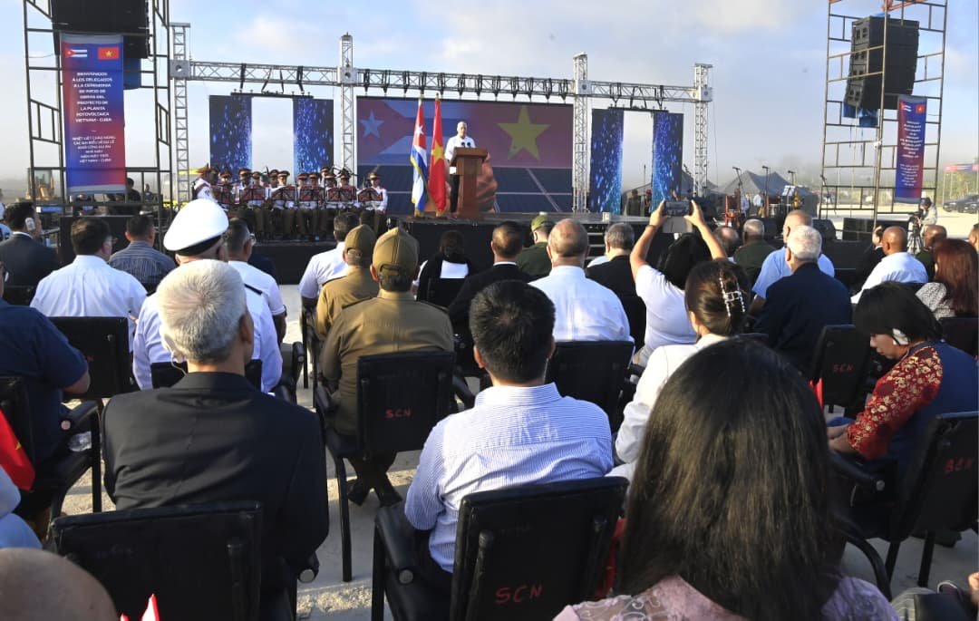 Así lo refirió el Primer Secretario del Comité Central del Partido y Presidente de la República, Miguel Díaz-Canel Bermúdez, quien en la mañana de este martes, junto a Ho Phuoc Dung, miembro del Comité Central del Partido Comunista de Vietnam y vice primer ministro de la República Socialista de Vietnam, encabezó las ceremonias por el 65 Aniversario del establecimiento de las relaciones diplomáticas y por el inicio de las obras del parque solar fotovoltaico Vista Alegre, en esta localidad.