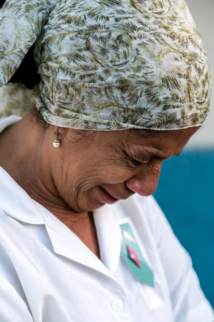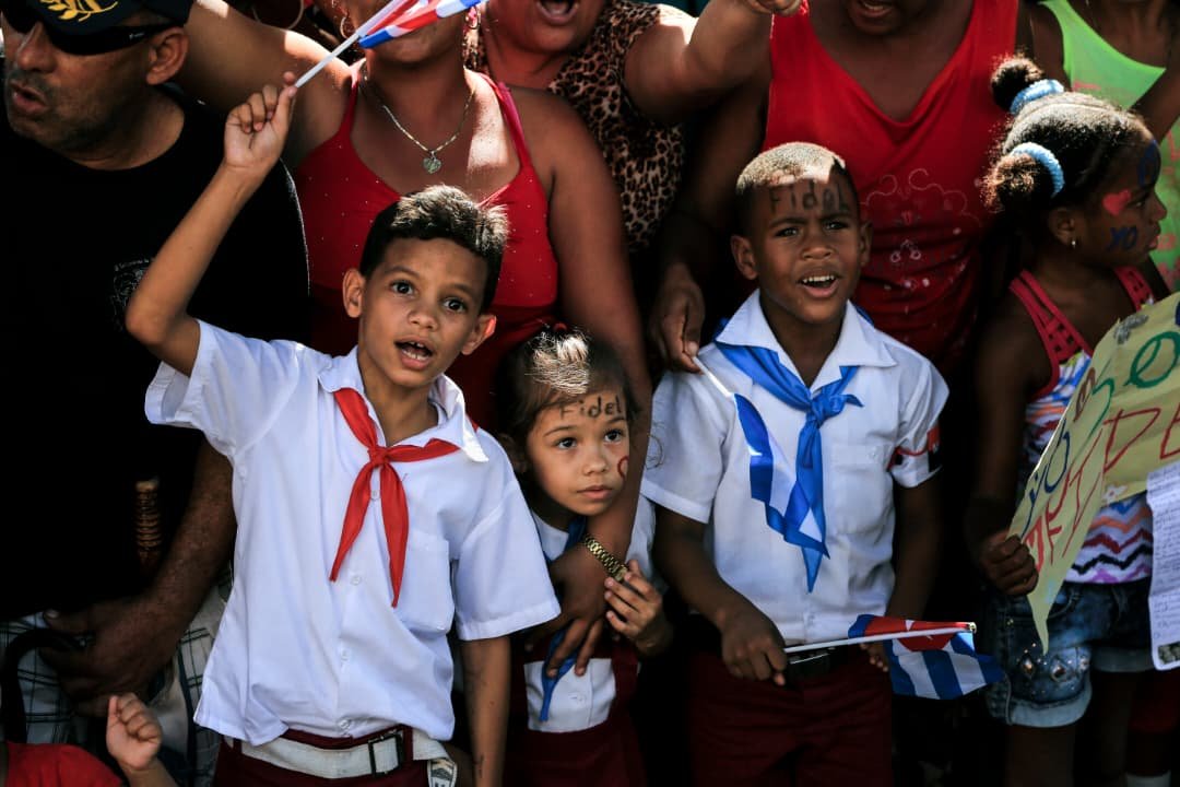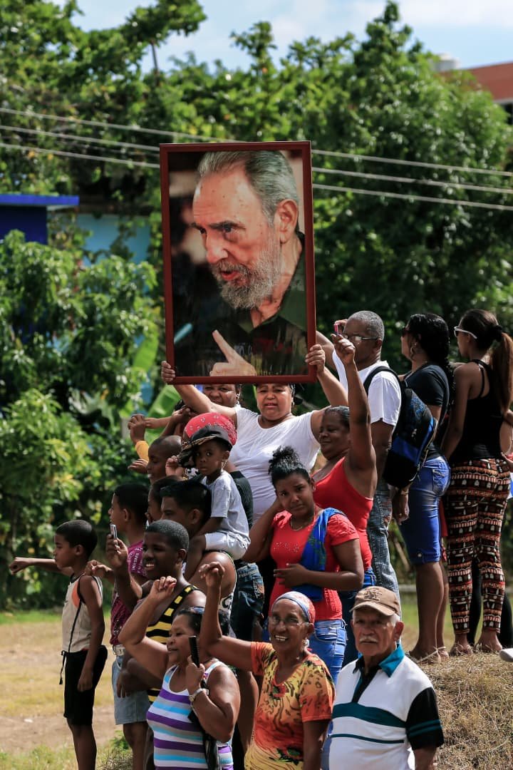 A la entrada hay estudiantes de secundaria y preuniversitario y un hombre ondea la bandera cubana desde el portal de un segundo piso; un anciano alza una foto de Fidel con gorra verde olivo y, mientras pasa frente a ellos, una viejecita en su andador, pasito a pasito, se acerca a la carretera para verlo bien.