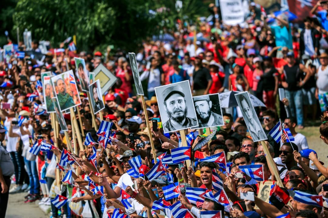 Decenas de celulares graban el instante. De un edificio cuelgan cuatro banderas cubanas; una de ellas enorme junto a una imagen del líder. En los balcones las personas lo aclaman. Camilo y Che, desde fotos en brazos de muchos, lo honran.