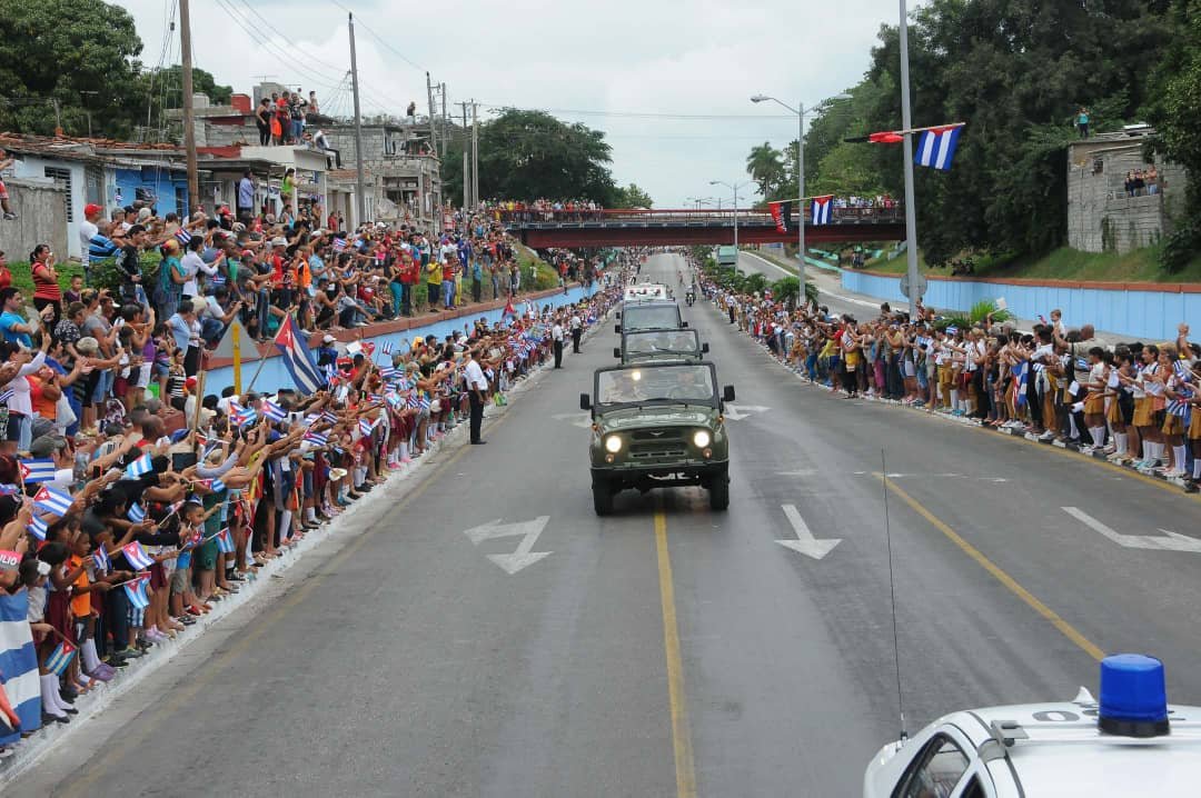Ante la solemnidad de la entrada, el Himno de Bayamo se escucha y llama al combate. Muchos visten de blanco, algunos simbolizan el luto en la cinta negra que han anudado en su brazo derecho, y la imagen de Fidel se levanta en los cuadros que sostienen otros. Maestros y pioneros saludan, agitan las banderas y observan el armón que se aleja igual que los hijos negados a la partida del padre.