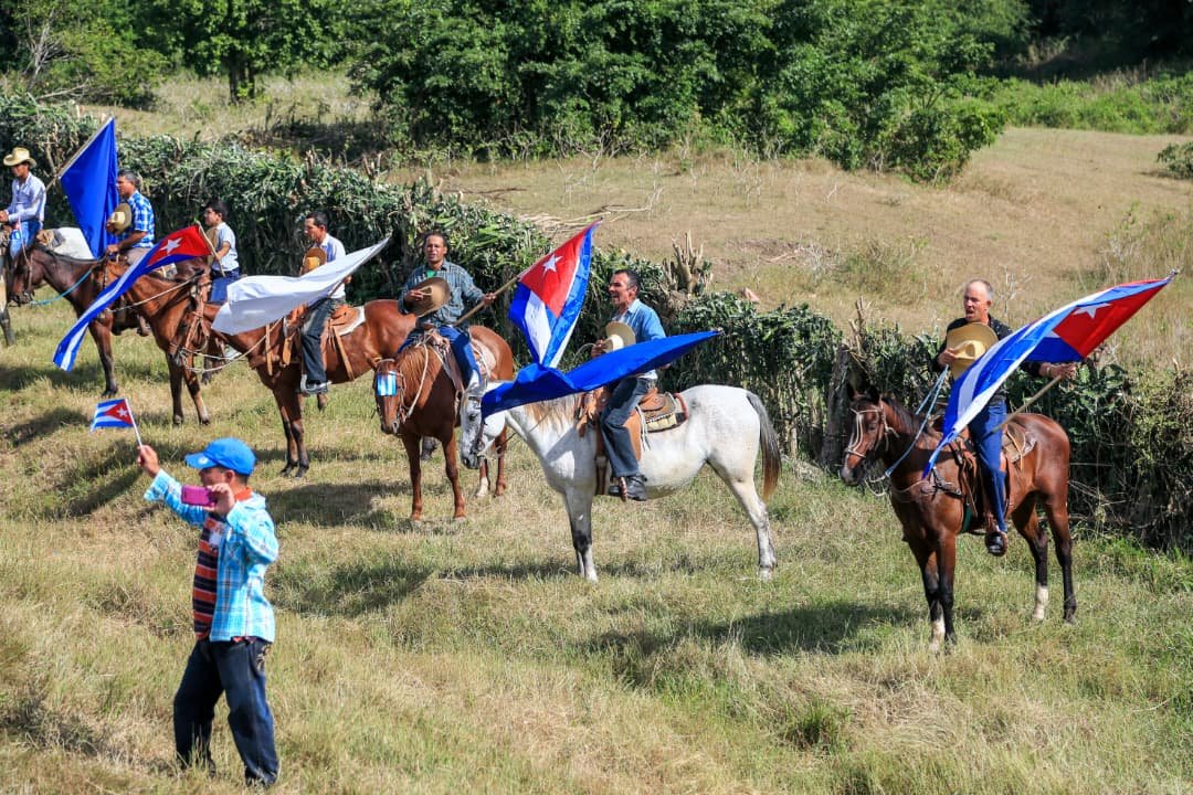 Hay carretas haladas por tractores en los caminos cercanos. En ellas llegaron hasta aquí los campesinos de los bateyes entre las lomas. Los hijos del pueblo saludan con banderas, con sus gorras y sombreros, e igual lo hacen las madres con sus hijos pequeños, y otra vez se ven los uniformes rojos y blancos con pañoletas y a escucharse la voz de los pioneros aclamando a Fidel.