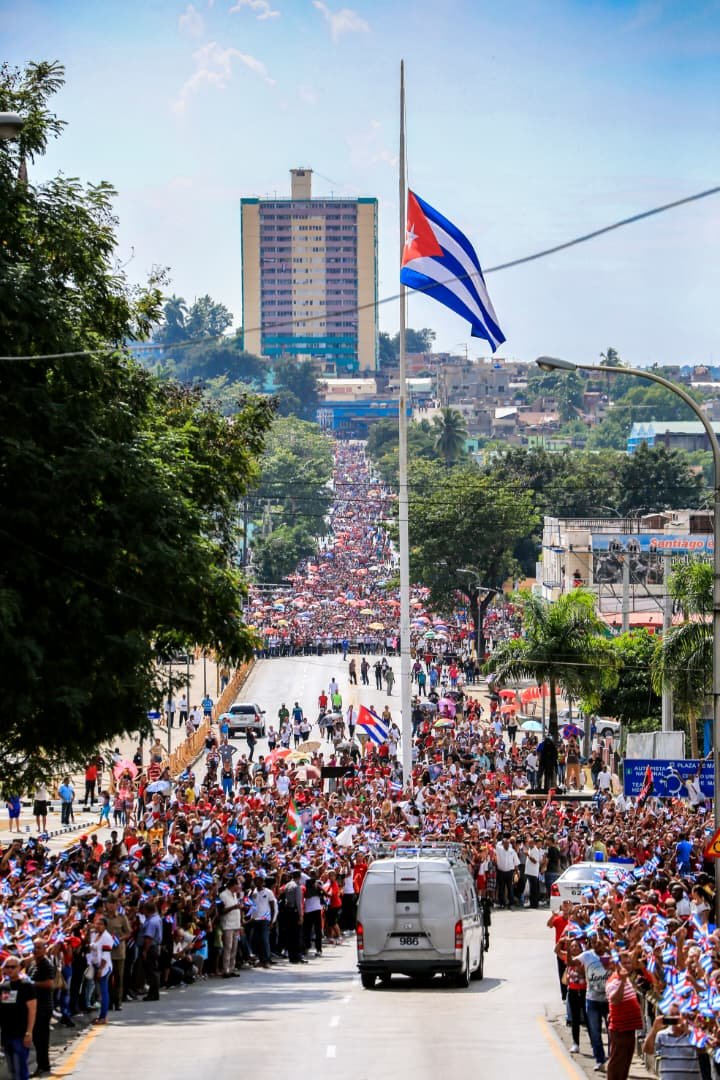 «¡Fidel es Santiago, Santiago es Fidel!» se escucha mientras la caravana, con sus luces encendidas, recorre las arterias principales de la cuna de la Revolución. Por todos lados hay carteles con imágenes y sabias frases del Comandante. Las banderas no dejan de agitarse. Los niños con sus uniformes escolares han tomado las calles y quienes no han tenido tiempo para llegar a la orilla de las avenidas corren para no perderse el paso del cortejo.