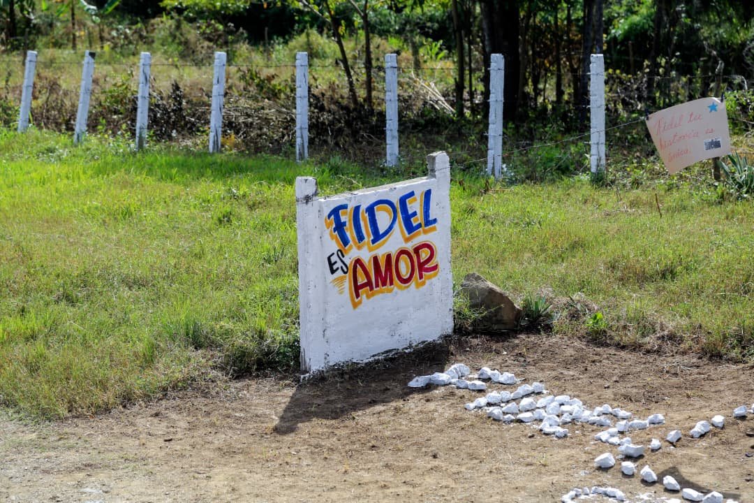 Entre postes a la entrada de un camino cuelgan de un cordel dos banderas, una roja y negra donde se lee con letras blancas Héroes del Moncada y la de la estrella única. En medio de ellas, cartones con fotos de Fidel recortadas de periódicos y, muy cerca, una anciana vestida con bata de casa apura su paso octogenario para observar silenciosa el cortejo.
