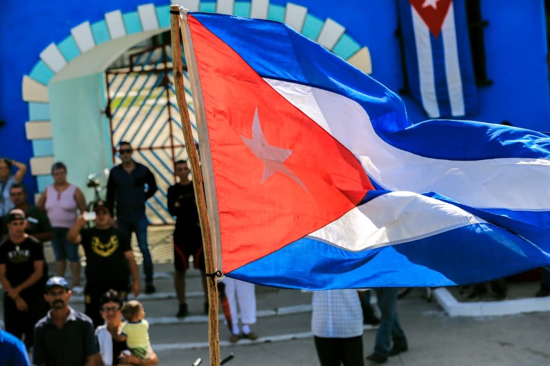 Tras los barrotes de una ventana muy cerca de la calle, han colgado una bandera cubana, bajo las franjas y la estrella, un hombre mira con tristeza el cortejo. La Plaza de la Caridad lo recibe con muchas enseñas y las notas del himno nacional. La música sale de unas bocinas, pero las voces no son grabadas, el coro a viva voz de la gente es el que se oye.