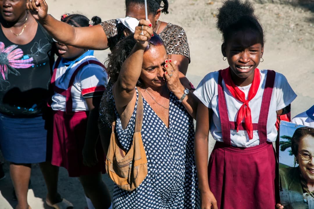 Una señora vestida de luto y entre la muchedumbre, en firme saluda. «¡Patria o Muerte!», grita alguien desde una acera. «¡Venceremos!», le responden cientos de voces.