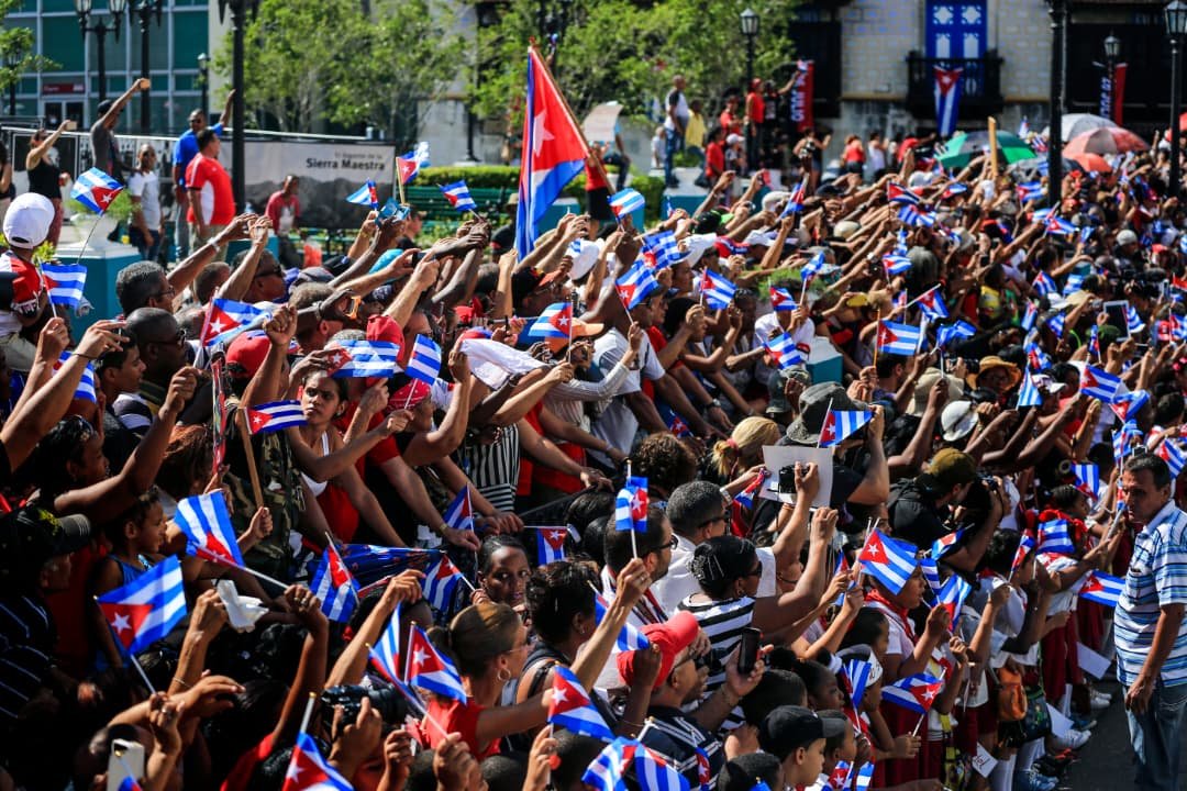 Frente a la estatua de José Martí, se oye: «¡Fidel, amigo, el pueblo está contigo!»; y bajo las palmas reales del parque, estudiantes universitarios, la mayoría con banderas cubanas, aclaman y observan el cortejo mientras surgen, desde audios, las notas del himno de Cuba.