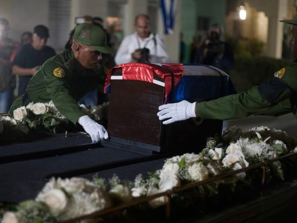 Cuba amanece este 30 de noviembre de 2016 como una ceiba llorosa, embravecida con el tiempo que, a veces, cual los vientos de cuaresma, agitados se llevan las hojas más altas. Es más de las 7:10 de la mañana. La firmeza de dos hombros en idéntico ritmo de marcha trasladan el cofre desde el pedestal en la Sala Granma hasta el armón verde olivo con el escudo nacional, donde lo acomodan entre rosas blancas, crisantemos, lirios y hojas de helechos.