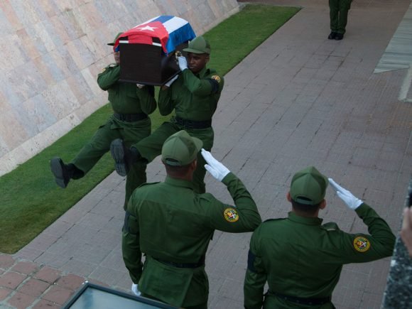 Son los pasos del oficial con el par de estrellas, del teniente coronel José Luis Peraza López y del joven sargento de veinticinco años Alexei Hernández Leal. Llevan en el brazo izquierdo un brazalete negro en señal de duelo. Con finas correas oscuras sujetan el cofre y le colocan encima una cúpula de cristal. Pronto iniciarán el viaje de más de mil kilómetros por la Carretera Central de la Isla hasta Santiago de Cuba, donde descansará para siempre el líder.