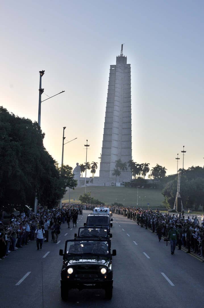 «¡Ahí viene Fidel!», dice alguien; y por un momento se rompe la mudez con que amaneció La Habana. Desfila el cortejo fúnebre frente al Martí pensativo de la Plaza de la Revolución, la misma que escuchó al estadista tantas veces y vio a millones devolverle aplausos y ovaciones a su palabra viva.